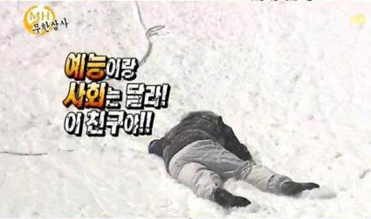 [엔터미디어=정덕현의 스틸컷] '무한도전'과 패러디는 떼려야 뗄 수 없는 관계. 급기야 '무한도전'은 '무한도전' 스스로를 패러디하는 단계에까지 이르렀다. 대본 없이 100% 애드립으로 만들어지는 리얼 콩트 '무한상사'는 '무한도전' 스키점프대 미션을 패러디했다. 미끄러운 경사면을 기어오르는 그 미션을 마치 남 일인 듯, 자신들도 할 수 있다며 다시 오른 '무한상사' 멤버들은 눈이 깊게 쌓여있어 너무나 쉽게 경사면을 오르면서 "이거 별거 아니네" 하고 스스로를 비꼬았다.