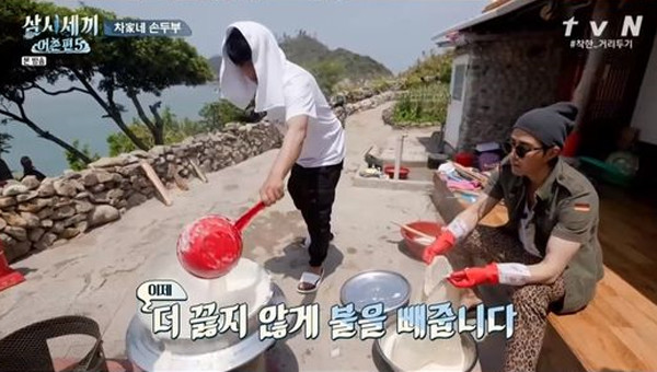 콩을 갈다가 맷돌을 돌리는 손잡이가 부러지기도 하고, 불 조절을 잘못해 콩물이 끓다 넘치기도 하는 그런 시행착오를 거쳐 겨우 겨우 만들어낸 두부. 어찌 맛이 없을 수 있을까. 살짝 맛을 본 차승원과 손호준은 그 고소함에 반한다. 두부를 만들며 나온 비지로 끓인 김치찌개와 볶음밥으로 점심을 먹는 모습이 참 맛있게도 보인다. 그런데 생각해보면 사다 먹으면 간편할 두부 한 모를 굳이 불편하게 직접 만들어 먹는 그 과정이 주는 묘미가 있다.