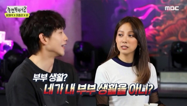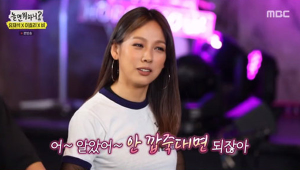 함께 혼성 그룹을 하면서 “꼬만춤은 포기 못한다”는 비의 이야기에도 이효리는 “그럼 나도 해도 돼?”하며 가슴을 만지는 포즈를 취해 비와 유재석을 당혹스럽게 만들었다. 그러지 말라는 유재석에게 이효리가 “왜 남자만 해?”하고 쏘아대고 그러면서도 “나이도 있고 그러니까 너무 어리게 가지 말자”고 덧붙이자 분위기는 한결 편안해졌다.
