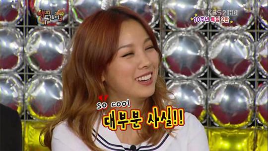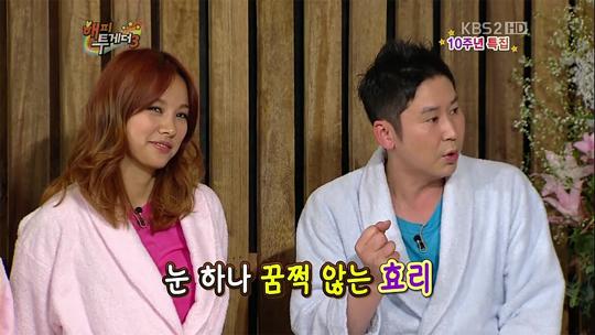 그러나 이번 <해피투게더 3> ‘10주년 기념 특집’에서 신동엽이 누누이 밝혔듯이 그녀는 달라도 너무나 달랐다. 전철을 밟기는커녕 놀랍게도 신동엽과 견주어 한 치도 밀리지 않는 진행 솜씨를 보여준 것이다. 더구나 그녀는 청순과 섹시를 오가며 수많은 남성들을 열광케 만든, 우리나라 가요 역사에 길이 남을 걸 그룹 ‘핑클’의 멤버가 아닌가. 그런 그녀가 길게 누워 자는 상태로 오프닝을 하게 될 줄이야! 그 누가 짐작이나 할 수 있었겠나.