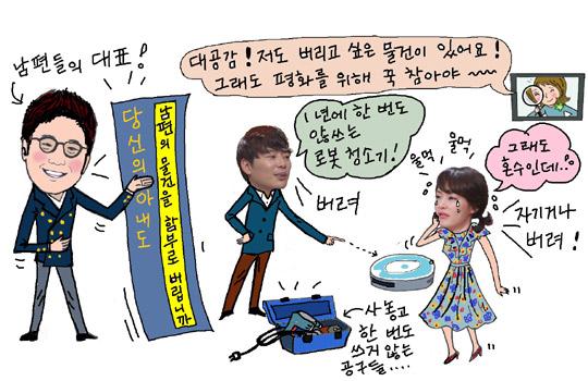 한쪽은 무조건 버리려 들고 한쪽은 극구 반대에 나서고, 한 나라 대통령을 뽑는 중차대한 사안도 아니건만 까짓 물건 하나 버리면서 왜 그리 의견 일치를 보기가 어려운 건지. 내 모든 걸 소중히 생각하리라 믿어 의심치 않았던 아내가 이사 때마다 매번 묻지도 따지지도 않고 자신의 물건들을 내다버리는 통에 서운하다는 주장이었는데, 김성주로서는 평생토록 보관하고 싶은 소지품들을 아내 진수정 씨 쪽에서는 하찮게 본다는 점이 문제였다.