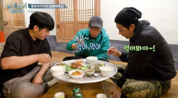 그렇게 만면에 웃음 가듯 낚아서 돌아온 유해진을 보며 차승원은 그 어느 때보다 기뻐했다. 그 어려움을 몸소 겪어본 터라 더더욱 그랬을 게다. 하지만 그건 그 날 만찬(?)의 끝이 아니었다. 통발을 확인하러 간 유해진은 놀랍게도 꽤 큰 붕장어가 들어 있는 걸 발견하고는 환호를 질렀다. 결국 그 날은 쏨뱅이 튀김에 붕장어 구이를 반찬으로 풍족하고 행복한 저녁을 보낼 수 있었다.