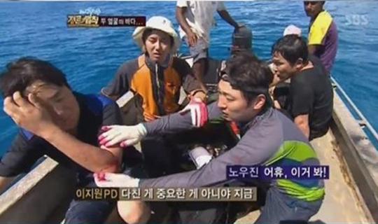 무사히 배 위로 구조된 이지원 PD는 또한 먼저 연기자들과 스텝부터 챙기는 모습을 보여주었다. 배가 전복되면서 배와 바닥의 산호 사이에 깔려 오른쪽 팔이 쓸리면서 피가 흐르고 있었지만 그것조차 당시에는 의식하지 못하고 있었다고 했다. 노우진이 그 피가 흐르는 팔을 가리키며 어떻게 하냐고 하자, 이지원 PD는 "지금 그런 게 중요한 게 아냐" 하고 말했다. 가족 같은 연기자들과 스텝들의 안전이 우선이었던 것.