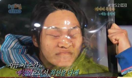 [엔터미디어=정덕현의 이슈공감] '이게 진짜 뭐하는 건지...' <1박2일>이 인제로 떠난 예능인 단합대회에서 코끼리코를 열 번 돌고 바늘에 실을 꿰는 예능올림픽(?)을 이수근이 할 때 깔리는 자막. '예능인 단합대회'라는 기치를 내건 것처럼, <1박2일>은 아예 대놓고 몸 개그로 웃음을 만들어보겠다 작정했다. '이게 뭐하는 건지' 하는 자막에는 웃음을 주기 위해 이런 짓까지 하고 있다는 '노력'의 의미와, 이런 짓까지 해야 한다는 '자조'의 의미가 섞여 있다.