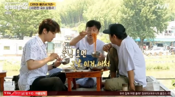 텐트 하나 치는 것도 익숙하지 않고, 그래서 평상 하나 치는 데도 땀을 뻘뻘 흘리면서도 김희원은 형 성동일의 이야기를 투덜대며 잘도 따른다. 땀에 선크림이 흘러내려 눈도 못 뜨겠다며 더운 날씨에 수박 타령만 계속하는 김희원이 가까이 있는 시장에 가서 국수를 사먹으며 드디어 “힐링”을 느낀다는 대목도 그렇다. 이렇게 굳이 멋진 대나무숲까지 와서 캠핑을 하면서 사먹을 때 더 힐링을 느낀다니.