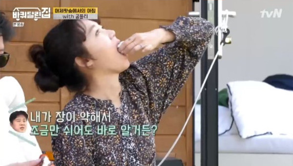 일어나 아침으로 무얼 먹을까 고민하던 차에 전날 전통시장에서 사온 떡을 떠올리고는 혹여나 쉬지나 않았을까 걱정하는 게스트로 온 공효진에게 김희원이 한 마디를 툭 던진다. “내가 장이 약해서 조금만 쉬어도 바로 알거든?” 쇠도 씹어먹을 것 같은 김희원이 그렇게 말하자 공효진의 웃음이 터진다.
