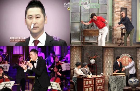 '골프 아카데미'에서는 스윙이 잘 안 된다는 질문에 응큼하게도 가슴 사이즈를 물으며 자신도 예전에 큰 사이즈(?) 때문에 퍼팅하기가 힘들었다고 눙을 쳤고, '짝'을 패러디한 '쨕'에서는 불법도박으로 수감된 사이비 승려로 등장해 그 특별한 직업(?) 때문에 여 재소자들의 인기를 받는 모습을 특유의 능청스런 연기로 보여주었다.