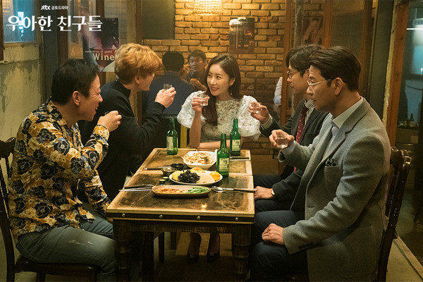 [엔터미디어=소설가 박생강의 옆구리tv] JTBC 금토드라마 <우아한 친구들>은 이전에 방송된 <부부의 세계>와는 다르다. 아마 첫 회를 본 순간부터 시청자들은 짐작했을 것이다. 이것은 여주인공 중심의 이야기가 아닌 네 명의 철이 덜 든 중년남자들의 소동극에 가깝다. 여기에 20년 전의 죽음을 둘러싼 스릴러를 현재의 살인사건과 교차시키며 핏빛 양념을 두루두루 뿌린다.