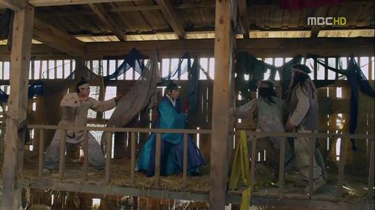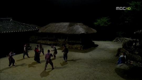 어쩌면 이준기라는 배우가 이전에도 <일지매>라든가 <개와 늑대의 시간>과 같은 작품들을 통해 액션 연기를 충분히 경험한 적이 있기 때문에 가능했을 터인데, 덕분에 심지어 카메라는 수직 부감과 같은 자유로운 구도에서도 능히 액션을 그릴 수 있게 되었다. 그리고 이러한 시도는 4회에서 돌쇠(권오중)가 최대감(김용건)의 수하들과 막싸움을 벌이는 장면이라든가 9회에서 은오가 부채를 무기로 1대 다수의 대결을 펼치던 장면에서도 확인할 수 있어, <아랑사또전> 액션 연출의 일관된 기조라 할 만하다.