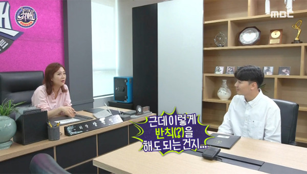 <최애 엔터테인먼트>는 트로트 경연 예능, 아이돌 팬덤, <놀면 뭐하니?>의 ‘싹쓸이’와 같은 성장 스토리에 모두 한 발씩 담그고 있지만 어느 한 가지도 진지하게 전개되지 않는다. 아이돌 그룹 출신의 한 출연자가 최애 엔터테인먼트 계약서에 서명하는 자리에서 원 소속사와 이야기 안 해도 되는 것이냐고 조심스레 묻는 장면이 있다. 방송에서는 그 친구의 순수함으로 표현했지만, 나이브한 설정을 보여준 대표적 사례다. 예능국장실을 ‘털어서’ 최애 엔터테인먼트 사무실 세트를 만들고, 이특과 김신영에게 사원증과 실장 명함도 ‘파준다’고 이들이 정말 MBC와 장윤정의 지원으로 가요계에서 활동하겠구나 생각하는 시청자는 많지 않다.