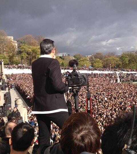 이것은 인터넷에 이미 퍼져버린 트로카데로 광장에서의 싸이 플래시 몹 광경이다. 프랑스 라디오 음악채널 NRJ 기획 하에 진행된 이 대형 행사를 싸이가 유럽 프로모션의 첫발로 삼았다는 것은 그의 스타일을 잘 보여주는 것이면서도 대단히 명민한 선택이었다고 보여진다. 싸이는 이미 미국에 이어 유럽 각국에도 팝 차트 상위에 올라가 있지만 역시 그의 근거지는 유튜브 같은 인터넷이라고 볼 수 있다. 유튜브 조회수 6억뷰라는 대기록.