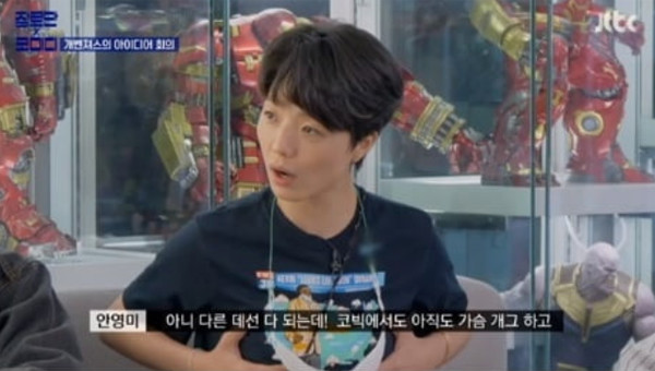 그 회의 테이블의 한 가운데 앉아 있었던 안영미는 <장르만 코미디>를 살리기 위해 총대를 맨 것 같은 투사(?)의 모습을 보여줬다. 그는 <장르만 코미디>가 너무 순하다며 MBC <놀면 뭐하니?>의 린다 G(이효리)를 자신과 비교했다. “저쪽에 린다G가 있으면 여기는 진짜 G리는 사람이 있는데”라며 너무 심심하게 가는 게 문제라고 지적했다.