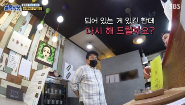 간판을 바꾸지 않은 이유를 묻자 “게을러서”라고 말하는 사장님은 그것도 모자라 홀에 손님이 앉을 자리를 모두 빼버렸다. 이유는 공간이 협소해서란다. 그것은 특이한 경영 방식(?)인 양 했지만 사실은 백종원의 말대로 “손님을 전혀 배려 안하는 사장님 편의 위주”의 선택들이 아닐 수 없었다.