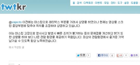 이게 무슨 말인가 고민했다. 마스킹 천을 내리는 기계는 모터가 들어가 있으니 고장날 수도 있다는 건 인정한다(지난 10여년 동안 단 한 번도 경험해보지 못한 일이다. 그리고 나는 직업상 1년에 200여편의 영화를 본다. 확률을 계산해보시라.) 이런 사고가 운영에 지장을 줄 정도로 자주 일어나는가? 그리고 만약 기계가 고장나서 마스킹 천을 내리지 못하는 사태가 일어났다고 치자. 그 결과는 어떤가. 바로 지금 CGV에서 상영하는 바로 그 상태가 된다. 다시 말해 아무리 머리를 짜고 이 답변은 천을 내리기 귀찮다는 말밖에 안 된다.