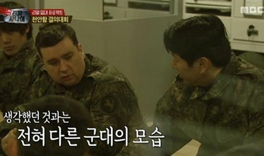 군대를 소재로 위무도 당당하게 진군 중인 <푸른거탑>이 극화된 캐릭터와 각종 대중문화를 패러디한 잘 짜여진 시트콤으로 성공했다면 <진짜 사나이>는 주말 예능 프라임타임에 병영 코미디가 아닌 병영 다큐를 택했다. 사실 군대의 일상이란 지겨우리만큼 특별하지 않다. ‘삽질한다’라는 말이 괜히 나온 말이 아니다. 이미 <진짜 사나이>는 각 잡고 앉아 있는 모습에서 사격훈련과 세면실까지 적나라한 군대 모습을 보여줌으로써 시청자들의 관심을 사로잡았다.