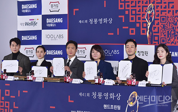 [엔터미디어 김나윤 기자]  제40회 청룡영화상 수상 배우들이 12일 오후 서울 영등포구 여의도CGV에서 열린 제41회 청룡영화상 핸드프린팅 행사에 참석해 기념촬영하고 있다. 왼쪽부터 정우성 남우주연상, 조여정 여우주연상, 조우진 남우조연상, 이정은 여우조연상, 박해수 신인남우상, 김혜준 신인여우상 전년도 수상자.