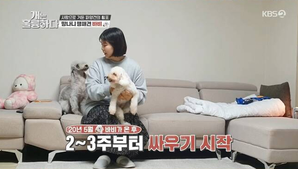 이번에 소개된 고민견은 지난 5월 새로 입양한 베들링턴 테리어종의 4살 바비였다. 본래 파양된 경험이 있는 14살 쿠키와 12살 슈를 입양해 10여 년을 아무 문제없이 행복하게 함께 지냈다는 보호자는 새로 바비를 입양하면서 고민이 생겼다고 했다. 노견들이라 쿠키는 노화와 치매가 온 상태였고, 슈도 눈에 약간의 이상이 있었지만 그래도 평화로웠다는 것. 하지만 바비가 온 후 매번 일으키는 마찰과 갈등 때문에 운신이 힘든 쿠키는 옷방으로 들어가 피하기 일쑤였고, 슈는 보호자가 안을 때 공격하려는 바비 때문에 늘 긴장하는 스트레스를 겪고 있었다.