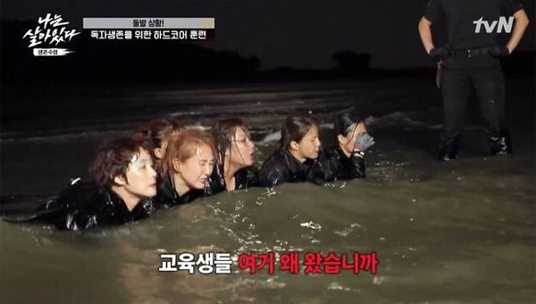 [엔터미디어=정덕현] “앞으로 취침, 뒤로 취침!” 사실 군대를 경험한 사람이라면 이런 지시에서 느껴지는 어떤 불편한 상황을 떠올리지 않을까. 낮 동안 화기애애한 분위기로 태양열을 이용해 비빔면과 치즈를 얹어 피자처럼 만든 식빵을 먹고, 캔을 잘라 호루라기 만드는 법이나 브래지어를 이용해 마스크를 만드는 법을 배우던 ‘생존교육’은, 갑자기 다른 분위기를 풍기는 교관들이 바닷가로 데려가 시작한 특훈(?)이 시작되자 ‘군대식 훈련’으로 변모했다.
