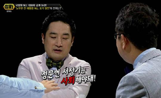정말 법률가의 마지막 양심이었을까. 그는 NLL 발언록을 갖고 고 노무현 대통령을 비판했던 새누리당의 두 의원은 사퇴해야 하며 자신을 포함 새누리당이 ‘똥볼’을 찼다고 주장했다. 국정원장의 전문 공개 또한 군인 출신이 절대로 독단적으로 결정을 내리지 않을 것이라는 의견도 밝혔다. 바로 이 지점이 사람들이 <썰전>을 보면서 느끼는 카타르시스다. 새누리당 의원 출신이 진영논리를 벗어나 뉴스의 이면과 정쟁에 대해 명확한 진단을 내리는 것은 그 어느 뉴스나 시사토크에서도 볼 수 없는 장면이었다.