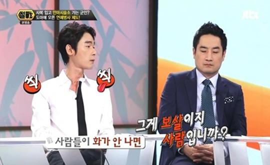 <썰전>의 태도는 제목부터 ‘담론’ 대신 ‘썰’이란 속어를 내세운 것에서 볼 수 있듯이 대안적이고 마이너한 감성을 바탕으로 한다. 어디든 성역 없이 독한 말을 던질 수 있다는 태도는 기본적으로 잃을 게 없다는 출발선상에서 시작하는 게 가장 이상적이다. 물론 본인 속으로는 다른 생각을 품고 있겠지만 그 대표적인 케이스가 바로 강용석이다.