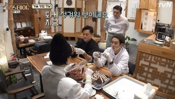 [엔터미디어=정덕현] tvN 예능 <윤스테이>가 겨울장사를 시작했다. 가을장사 때 내놨던 메뉴는 새롭게 바뀌었다. 밀전병이 애피타이저로 등장했고, 메인메뉴도 찜닭, 산적, 수육으로 바뀌었으며 후식도 인절미를 이용한 와플이 제공되었다. 본격적인 장사가 시작되기 하루 전 새 메뉴들을 만들어봤던 지난 회에서는 제대로 성공한 음식이 없어 과연 이대로 괜찮을까 싶었지만, 실제 외국인 손님들에게 선보인 음식들은 호평 일색이었다.