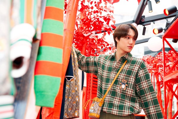 카이는 블루 컬러의 보우 디테일이 돋보이는 테디 베어 장식의 그린 체크 셔츠를 입고, 테디 베어 프린트의 미니 버킷 백과 롸이톤 스니커즈 등,