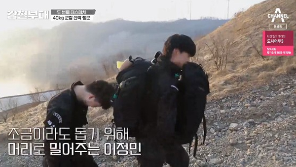 너무나 괴로워하는 이정민에게 팀원들조차 포기를 권했다. 굳이 탈락이 확정된 마당에 끝까지 할 필요 없다는 이야기였다. 하지만 이정민은 졌어도 포기하지 않는 쪽을 택했다. 결국 김민수가 이정민의 40kg 군장을 대신 메고 무려 80kg이나 되는 군장으로 걸어 나가기 시작했다.