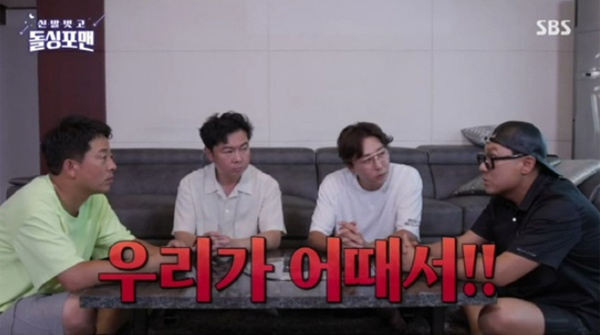 ‘행복에 목마른 네 남자의 토크쇼’를 표방하는 <돌싱포맨>은 SBS <미운 우리 새끼>의 스핀오프다. <미운 우리 새끼>에 함께 등장해 큰 웃음을 선사하던 멤버들 중 이혼 경력이 있는 탁재훈, 임원희, 이상민, 김준호를 따로 모았다. 제목에 ‘신발 벗고’가 들어가는 이유는 예능을 진행하는 공간이 네 멤버의 집이고 이곳으로 게스트를 부르는 포맷이라 그렇다.