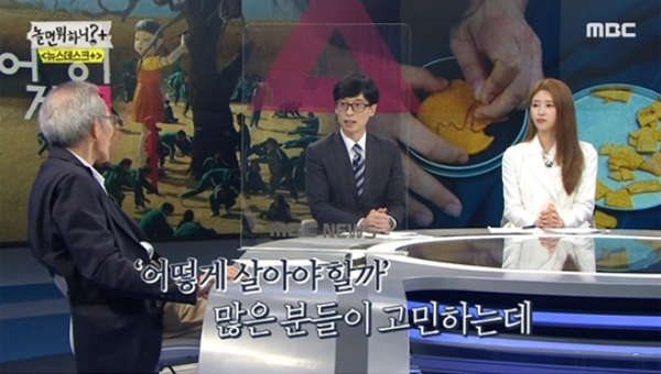 그는 <오징어 게임>이 “놀이의 상징성을 통해서 사회의 부조리한 현상을 찾아내는” 작품이라고 했다. 456억을 차지할 수 있는 최후의 1인이 되기 위한 생존게임을 담고 있는 <오징어 게임>이 현 사회의 문제들을 놀이를 통해 은유하고 있다는 얘기였다. 그에게 어떻게 살아야 할까를 묻는 유재석의 질문에 대해서도 오영수 배우는 <오징어 게임>을 염두에 둔 답변으로 위로의 메시지를 던졌다.