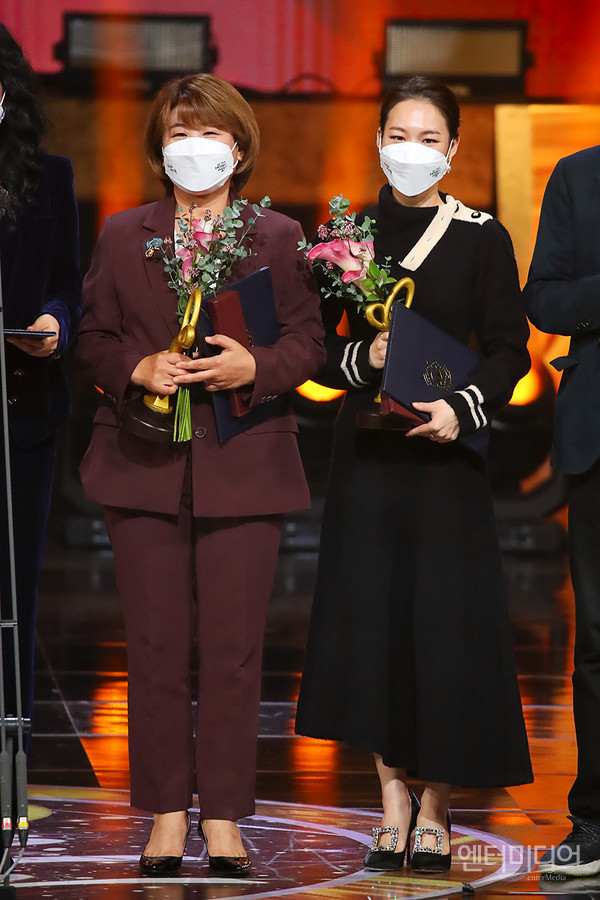[엔터미디어 김나윤 기자] 배우 이정은, 한예리(왼쪽부터)가 28일 오후 서울 중구 국립극장에서 열린 ‘제 12회 대한민국 대중문화예술상(2021)’ 시상식에 포토월에 참석해 국무총리 표창을 받은뒤 기념촬영을 하고 있다.