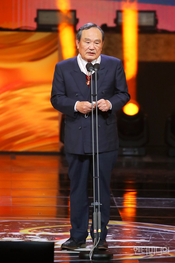 [엔터미디어 김나윤 기자] 배우 박인환이 28일 오후 서울 중구 국립극장에서 열린 ‘제 12회 대한민국 대중문화예술상(2021)’ 시상식에 참석해 '보관문화훈장'을 받은 뒤 소감을 말하고 있다.