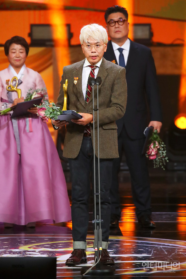 [엔터미디어 김나윤 기자] 김태호 PD가 28일 오후 서울 중구 국립극장에서 열린 ‘제 12회 대한민국 대중문화예술상(2021)’ 시상식에 참석해 '대통령 표창'을 받은 뒤 소감을 말하고 있다.
