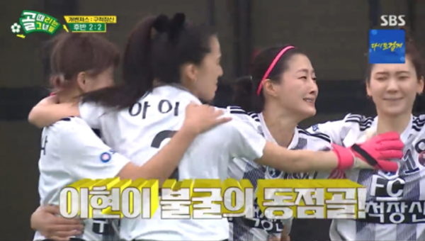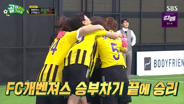 이대로 FC구척장신의 흐름대로 흘러갈 거라 여겨졌지만 후반전에 이르러 FC개벤져스의 반격이 시작됐다. 후반 3분 오나미가 동점골을 기록해 분위기를 반전시키더니 후반8분 김혜선이 극적인 역전골을 터트린 것. 하지만 이현이는 종료 1분을 남겨 놓고 또다시 동점골을 기록해 승부를 원점으로 되돌렸다. 결국 승부차기에서 조혜련의 철벽 수비로 FC개벤져스가 승리했지만 두 팀 모두 더할 나위 없는 명승부를 보여줬다.