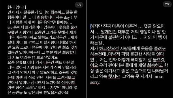 그런데 사과문이라고 그것도 맞춤법, 띄어쓰기 하나 제대로 하지 못한 채 헨리가 올려놓은 글이 이러한 불편함을 해소시켜줄 리 만무다. 게다가 ‘피 운운’하는 이야기는 심각한 수준이다. 제아무리 개인 SNS라고는 해도 엄연히 소속사가 존재하는데 이런 일이 전혀 관리되지 않는다는 건 더더욱 놀라운 일이다. 그간 MBC <나 혼자 산다> 같은 프로그램을 통해 좋은 이미지를 쌓았던 일들이 무색해지는 상황이다.