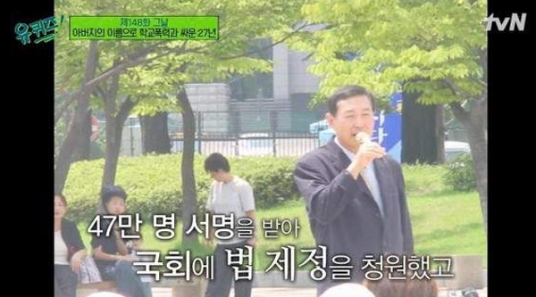 그럼에도 세상은 쉽게 바뀌지 않았다. 만나주지 않아 담당 공무원과 대화조차 하기 힘들었다. 하지만 포기할 수가 없었다. 아들에 대한 의무감, 책임감이 있었기 때문이었다. 학교폭력 자체를 교육부가 인정하지 않던 시절, 46만 명의 서명을 통해 특별법 제정을 국회에 청원했고 드디어 법이 제정됐다. 그것이 ‘학교폭력예방 및 대책에 관한 법률’이었다.