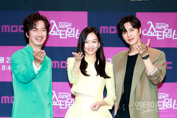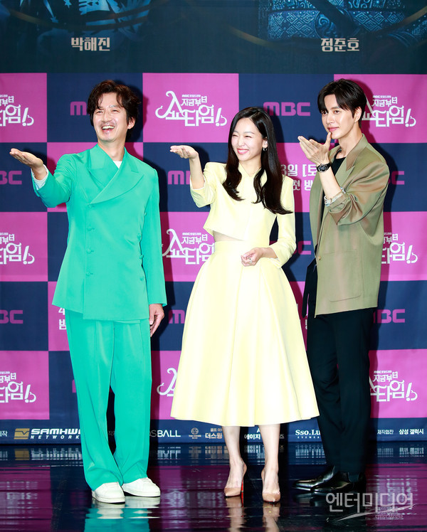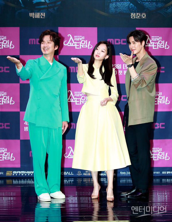 [엔터미디어 김나윤 기자] 배우 정준호, 진기주, 박해진(왼쪽부터)이 22일 오후 2시 서울 마포구 상암동 MBC 골든마우스홀에서 열린 MBC 토일드라마 '지금부터 쇼타임' 제작발표회에 참석해 포즈를 취하고 있다.