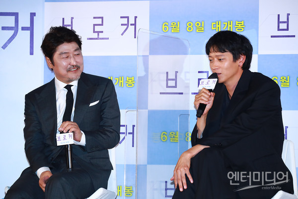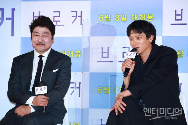 [엔터미디어 김나윤 기자] 배우 송강호, 강동원이 10일 오전 서울 용산구 CGV용산아이파크몰에서 열린 영화 '브로커(감독 고레에다 히로카즈)' 제작보고회에 참석해 기자들의 질문에 답하고 있다.