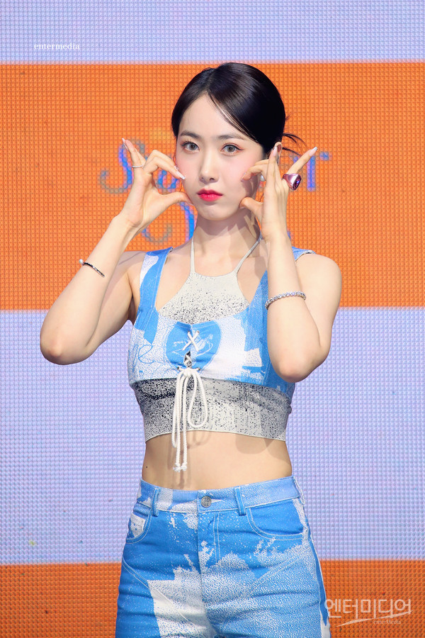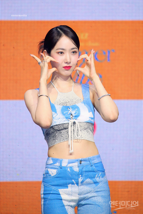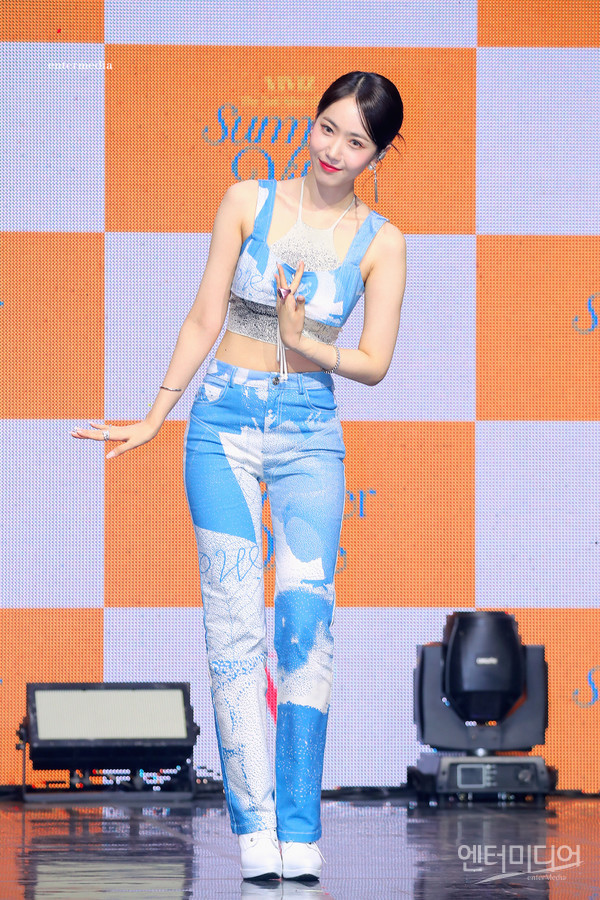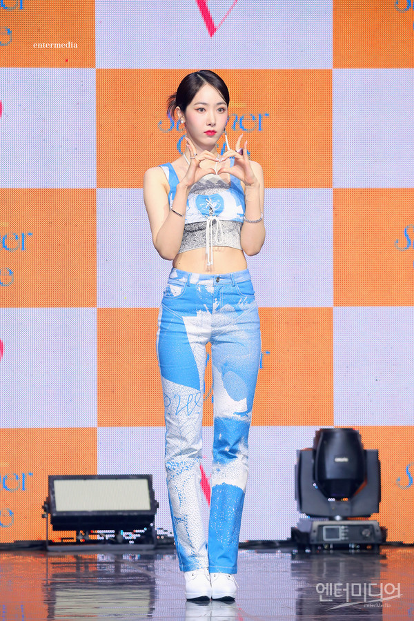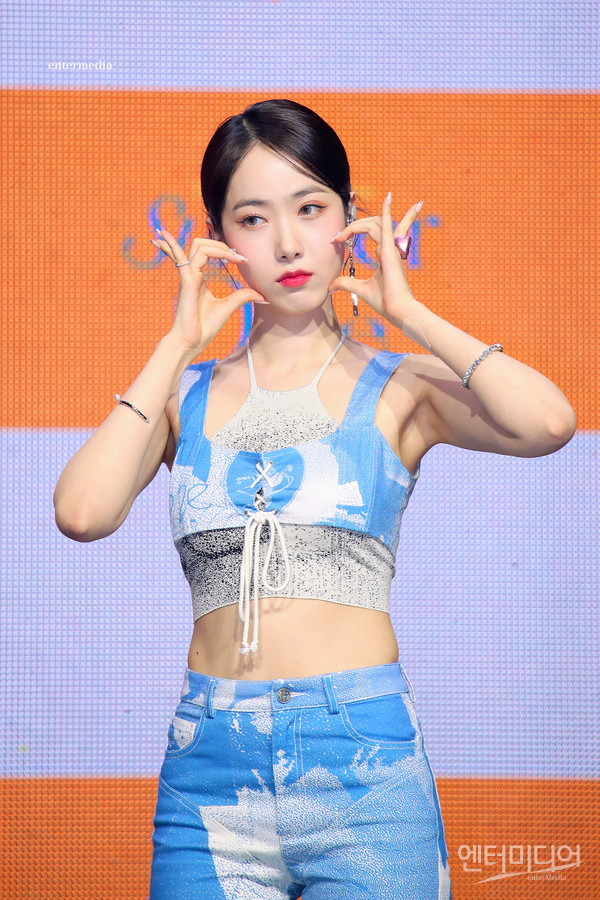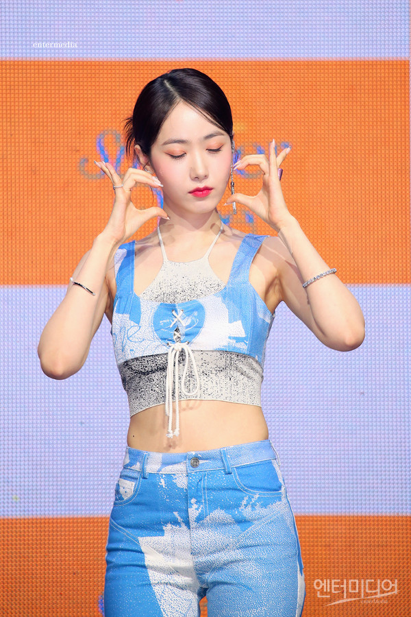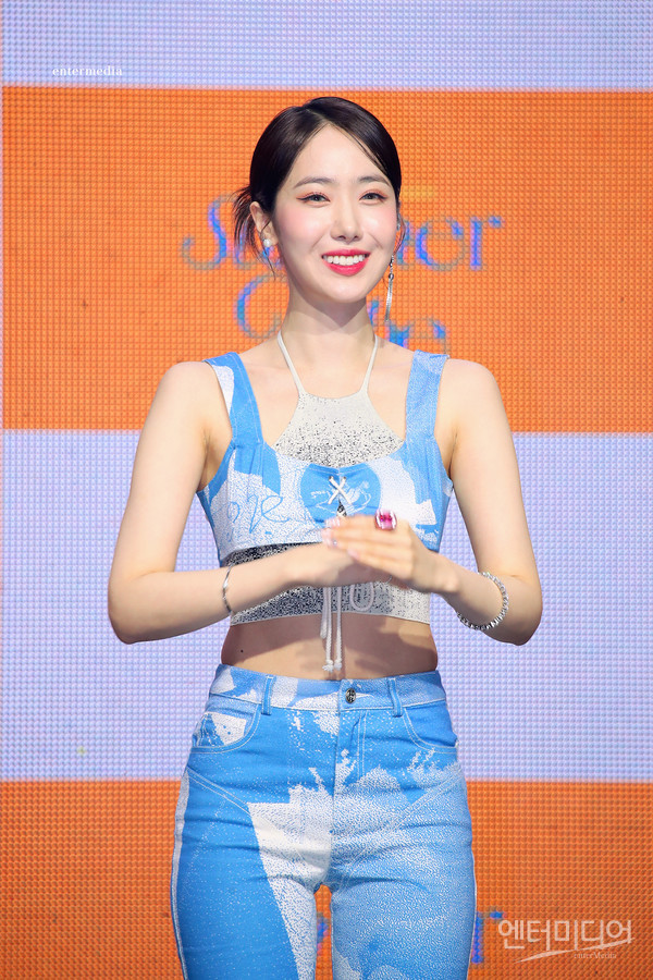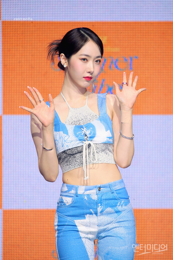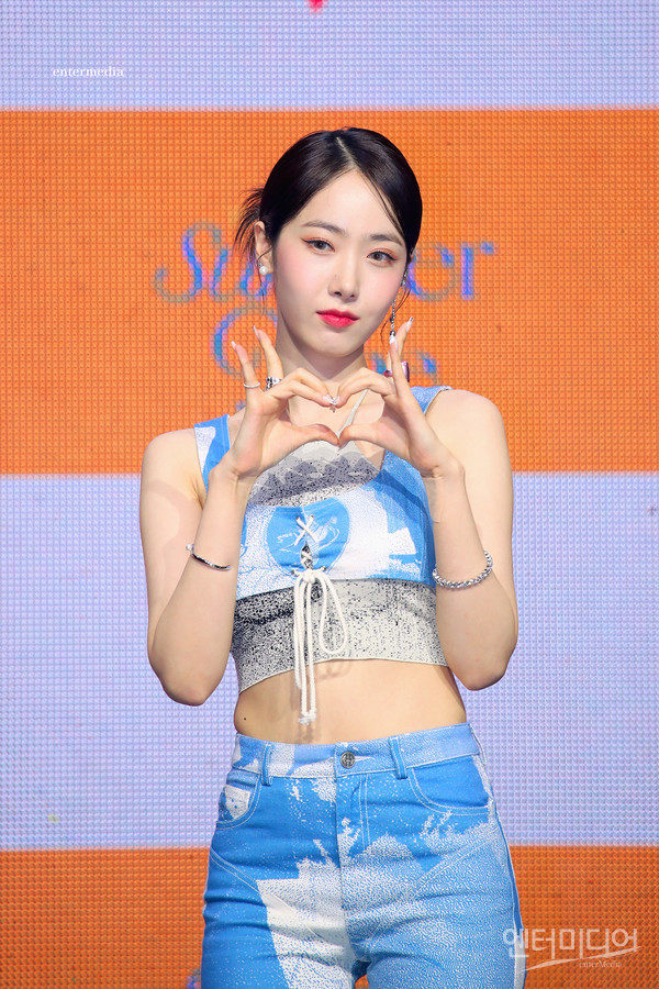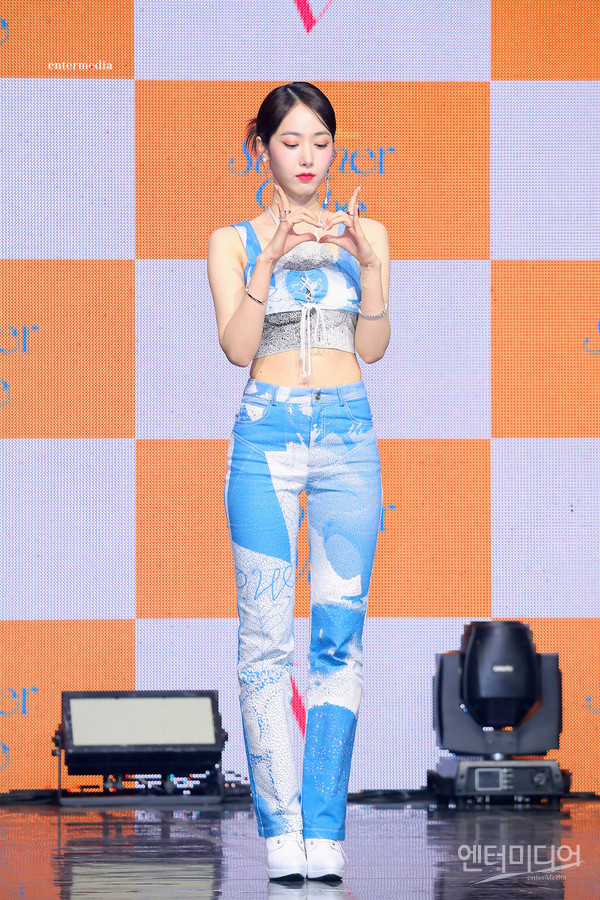 [엔터미디어 김나윤 기자] 가수 비비지(VIVIZ) 신비가 6일 오후 서울 광장동 예스24라이브홀에서 열린 두 번째 미니앨범 ‘Summer Vibe(서머 바이브)’ - ‘LOVEADE(러브에이드)’ 발매 기념 쇼케이스에 참석해 포즈를 취하고 있다.