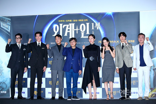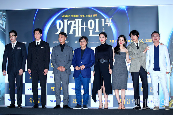 [엔터미디어 김나윤 기자] 배우 소지섭(왼쪽부터), 김우빈, 조우진, 최동훈 감독, 염정아, 김태리, 류준열, 김의성(왼쪽부터)이 13일 오후 서울 용산구 CGV 용산아이파크몰에서 열린 영화 '외계+인' 1부의 언론시사회 및 기자간담회에 참석해 포즈를 취하고 있다.