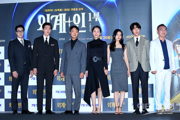 [엔터미디어 김나윤 기자] 배우 소지섭(왼쪽부터), 조우진, 염정아, 김태리, 류준열, 김의성(왼쪽부터)이 13일 오후 서울 용산구 CGV 용산아이파크몰에서 열린 영화 '외계+인' 1부의 언론시사회 및 기자간담회에 참석해 포즈를 취하고 있다.