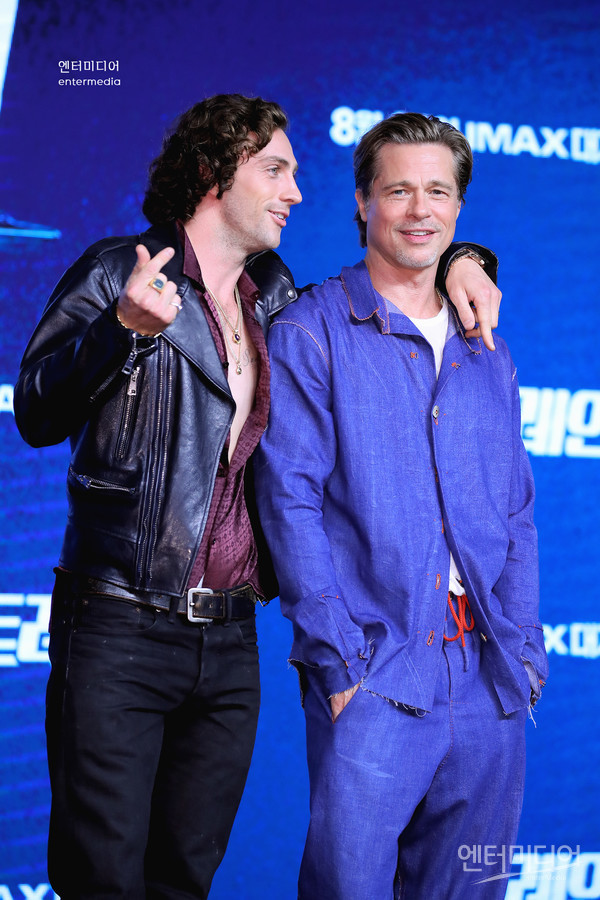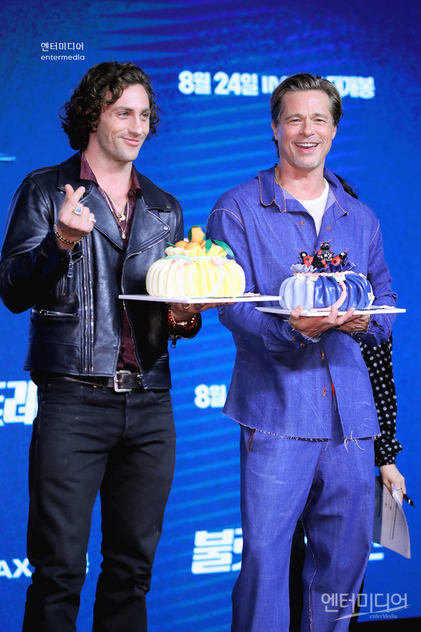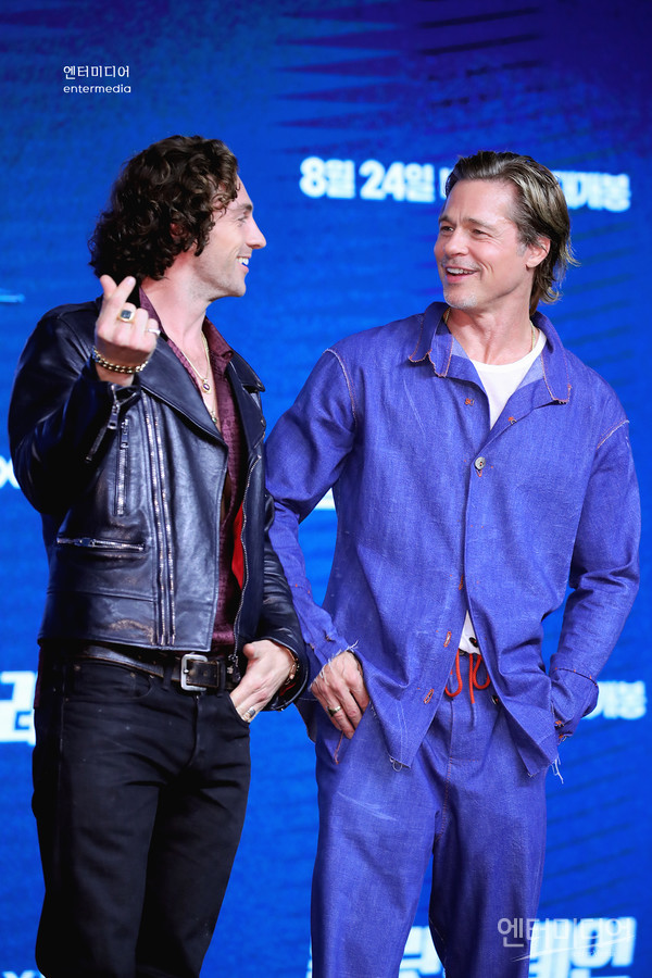 [엔터미디어 김나윤 기자] 배우 애런 테일러 존슨, 브래드 피트(왼쪽부터)가 19일 서울 영등포구 콘래드호텔에서 진행된 영화 ‘불릿 트레인’의 프레스 컨퍼런스에 참석해 취재진을 향해 포즈를 취하고 있다.