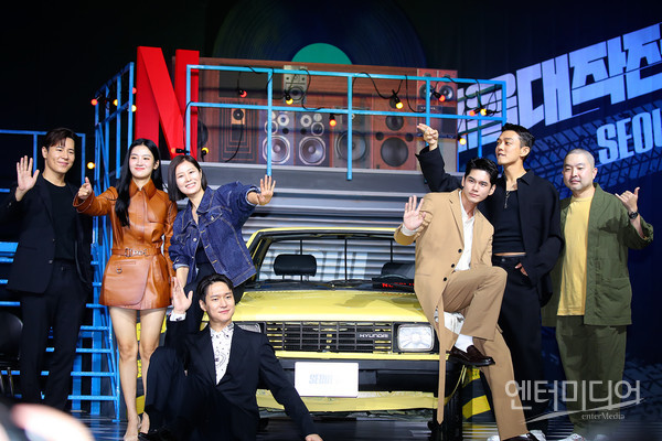[엔터미디어 김나윤 기자] 문현성 감독과 배우 옹성우, 박주현, 유아인, 문소리, 이규형, 고경표가 23일 오전 서울 강남구 그랜드 인터컨티넨탈 서울 파르나스에서 열린 넷플리스의 영화 ‘서울대작전’ 제작보고회에서 포즈를 취하고 있다.