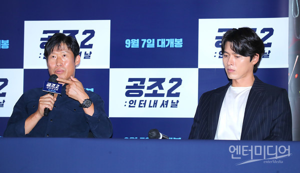 [엔터미디어 김나윤 기자] 배우 유해진, 현빈이 30일 오후 서울 용산구 CGV용산아이파크몰에서 열린 영화 '공조2:인터내셔날'(감독 이석훈) 언론시사회에 참석해 취재진의 질문에 답하고 있다.