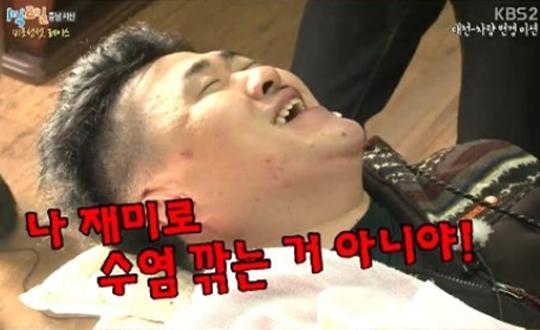 요즘, 1900년대 초중반 빈티지 패션이 유행하면서 포마드와 리젠시컷 등으로 대표되는 이발소의 남성 문화가 각광받고 있긴 하지만 여전히 이발소라 하면 오래된 기억으로 남아 있는 추억 혹은 과거의 장소다. 여기서 데프콘은 47년 경력의 장인의 손길을 느껴야 미션을 통과할 수 있었고 그 까닭에 20년 만에 수염이 밀렸다. 여기까지. 어색한 얼굴을 보고 웃고 끝날 수 있는 상황이었다. 물론, 그 모습 자체가 웃기기도 했으나 백미는 나이 지긋한 이발사 선생님과 데프콘의 주고받기와 망설임이 만들어내는 초조함이었다. 거기에 차태현의 리액션이 더해져 <1박 2일>의 최고의 재미를 만들어냈다.
