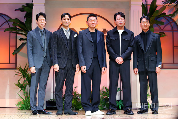 [엔터미디어 김나윤 기자] 배우 유연석(왼쪽부터), 박해수, 황정민, 하정우, 조우진이 7일 오전 서울 강남구 조선팰리스 서울강남에서 열린 넷플릭스 시리즈 ‘수리남’ 제작발표회에 참석해 포토타임을 갖고 있다.