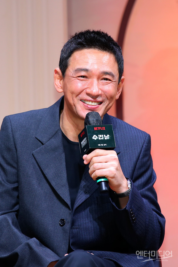 [엔터미디어 김나윤 기자] 배우 황정민이 7일 오전 서울 강남구 조선팰리스 서울강남에서 열린 넷플릭스 시리즈 ‘수리남’ 제작발표회에 참석해 취재진의 질문에 답하고 있다.