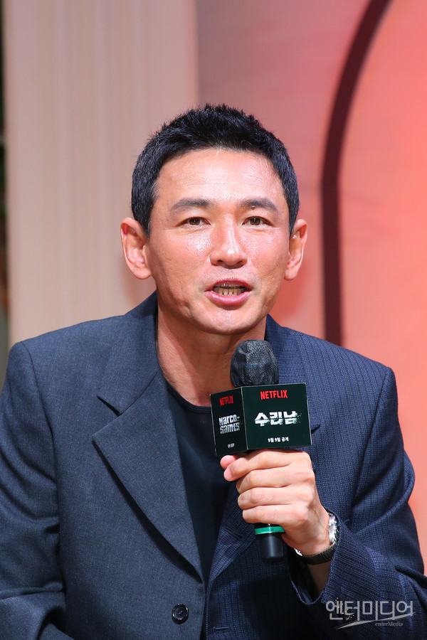 [엔터미디어 김나윤 기자] 배우 황정민이 7일 오전 서울 강남구 조선팰리스 서울강남에서 열린 넷플릭스 시리즈 ‘수리남’ 제작발표회에 참석해 취재진의 질문에 답하고 있다.
