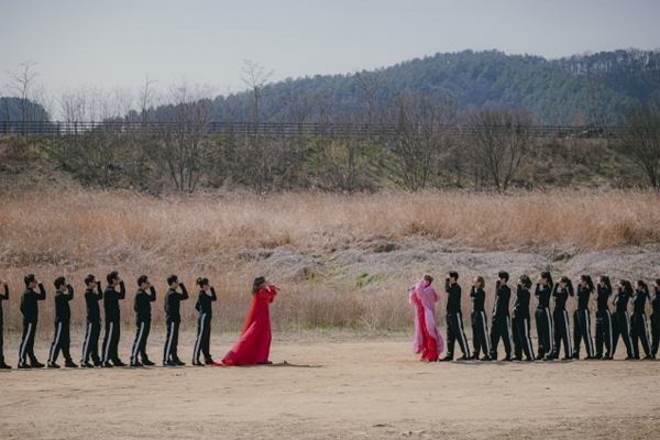그런데 놀라운 건 이 상상을 <테이크 원> 제작진이 실제로 실현해냈다는 점이다. 하늘에서부터 시작된 무대는 스카이다이버들의 화려한 활강으로 문을 열었고, 지상에서는 200명의 선글라스를 낀 댄서들이 순차적으로 계획된 카메라의 움직임에 맞춰 일사분란한 댄스를 선보였다. 이찬혁과 이수현은 단 한 번으로 끝나는 이 무대를 위해 카메라가 다른 곳을 잠시 비추는 사이 다음 장소로 뛰어가 다음 장면을 이어받아 찍는 일을 반복했다.