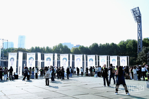 공연전 팬들이 기념촬영을 하기위해 길게 줄을 서서 기다리고 있다.