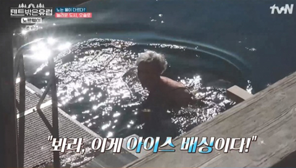 그렇게 산책을 하는 그들은 바닷물에 뛰어드는 사람들이 사실 사우나와 찬 바닷물을 오가는 노르웨이의 오랜 전통인 ‘아이스 배싱(ice bathing)’이라는 걸 알게 된다. 거기 연배가 있으신 어르신에게 다가가 “춥지 않냐”고 묻고 물에 들어가는 걸 보며 엄지 척을 해준다. 그리고 영상은 며칠 후 이들이 그 아이스 배싱을 할 거라는 걸 예고한다.